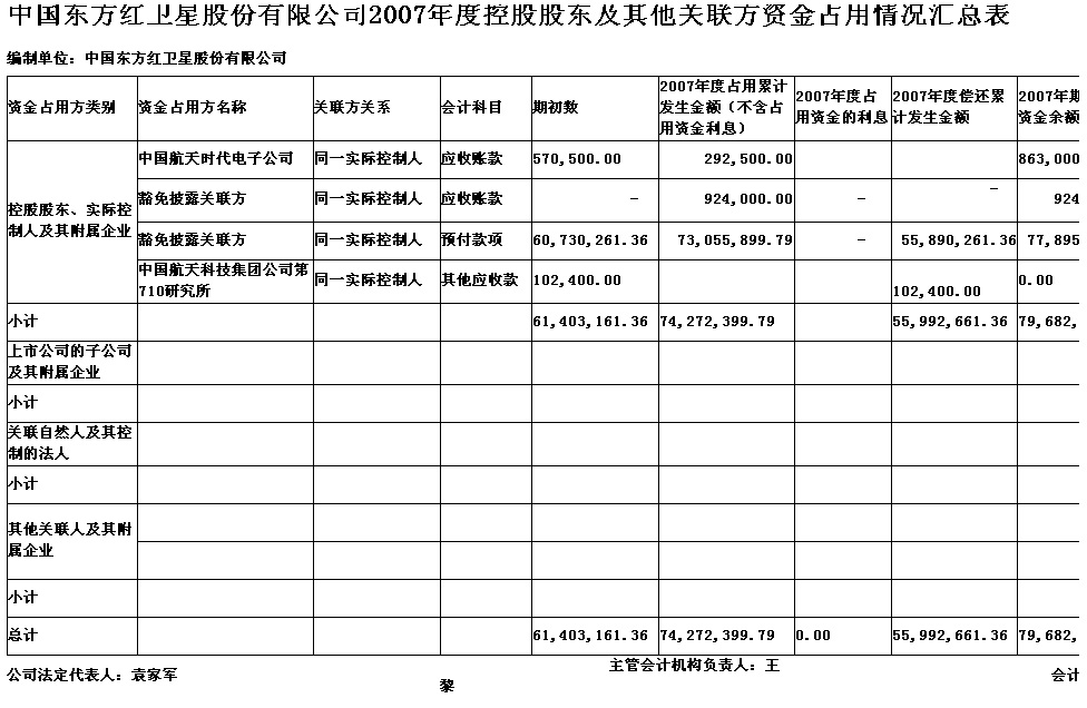 關于中國東方紅衛星股份有限公司2007年度控股股東及其他關聯方